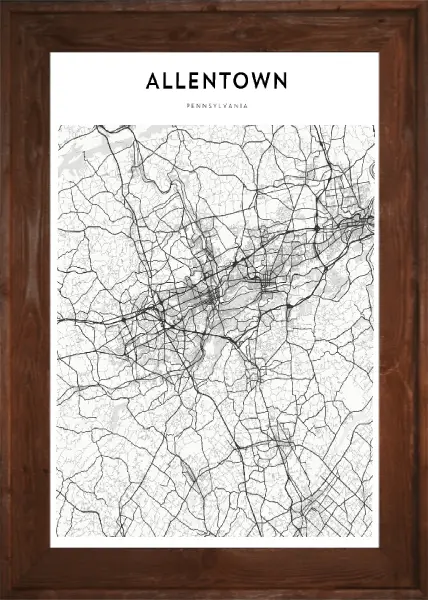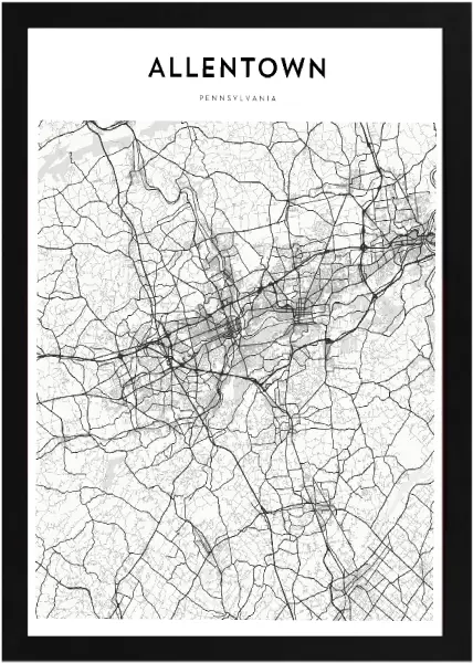 Incredible Framed Allentown Map! This map is a black and white grid system style sketch of the city of Allentown. Hang this stylish wall decoration in your home or office to show where you are from in a classy way.