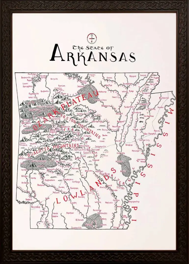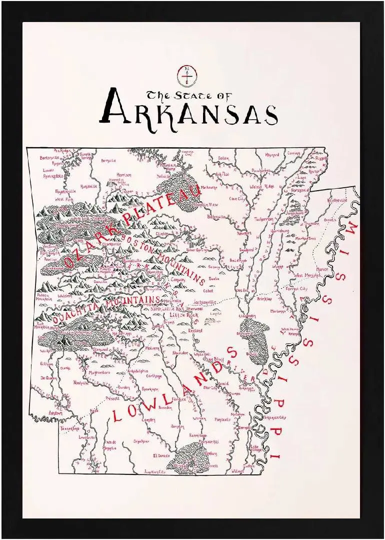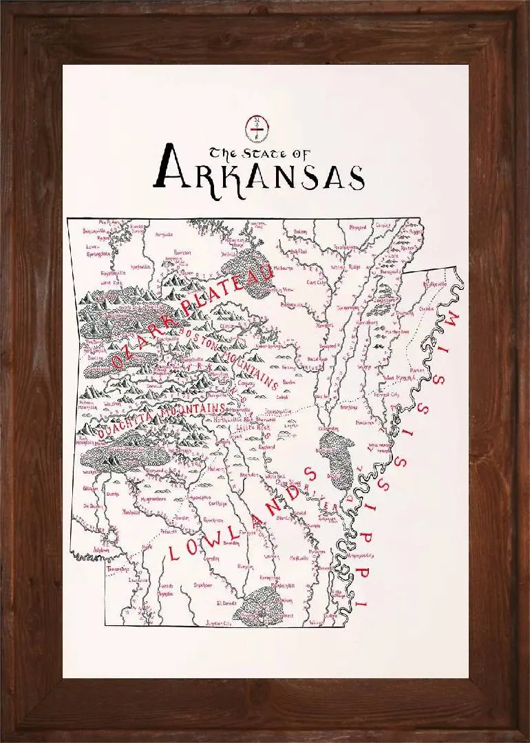 Beautiful Framed Arkansas Map! This map is hand drawn in a lord of the rings style design and is printed on high quality paper. This map represents the great state of Arkansas and can bring history to your home or office. The Arkansas Map features all the incredible geographical locations of this amazing state.