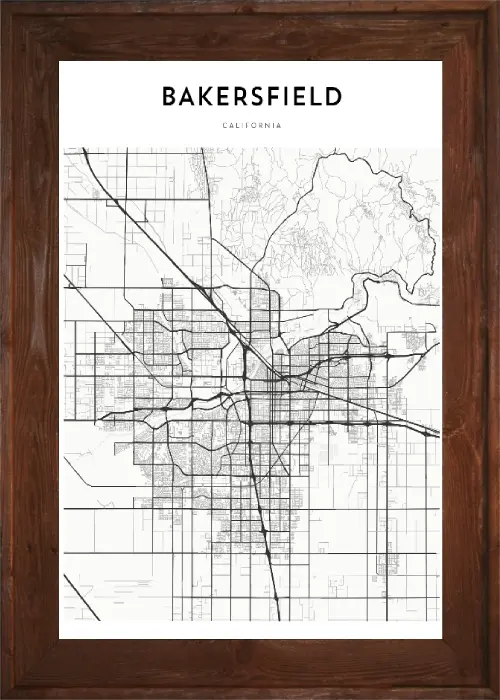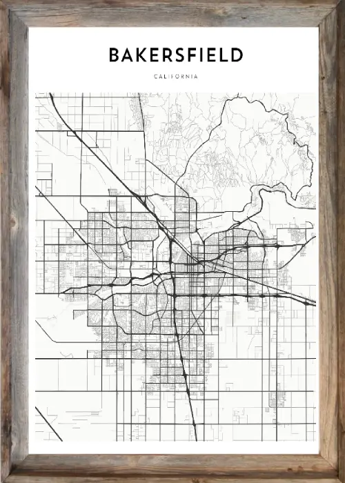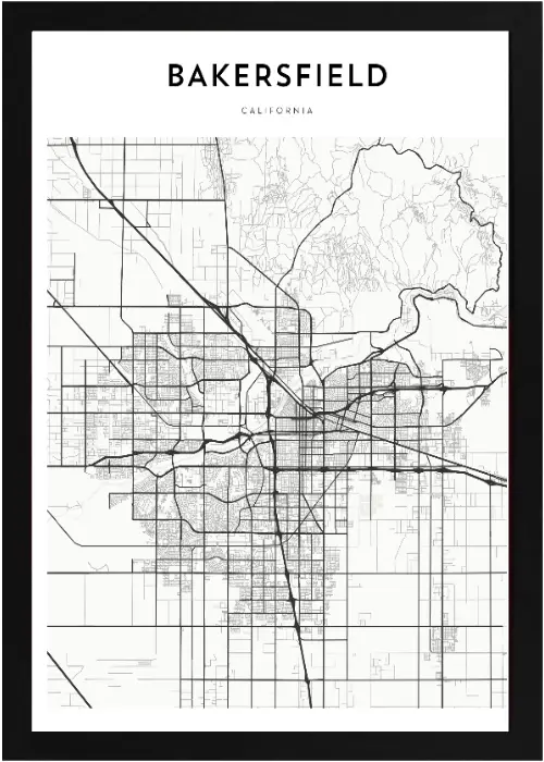 Amazing Framed Bakersfield Map! This map is a black and white grid system style sketch of the city of Bakersfield. Hang this stylish wall decoration in your home or office to show where you are from in a classy way.
