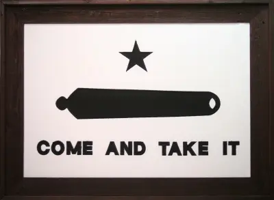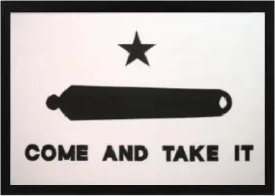 An iconic flag from the Lone Star State ! The Come and Take It flag represents the proud history of Texas and can bring a bit of character to your home or office. Featuring the words “Come and Take It” and a cannon on a white background. Made famous after the Come and Take it flag battle of Gonzales. This framed item would work great for any room that needs some color.