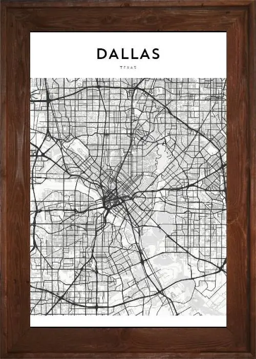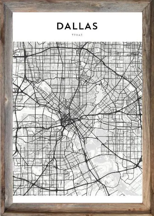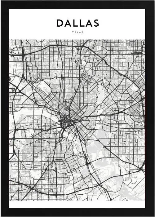 Amazing Framed Dallas Map! This map is a black and white grid system style sketch of the city of Dallas. Hang this stylish wall decoration in your home or office to show where you are from in a classy way.