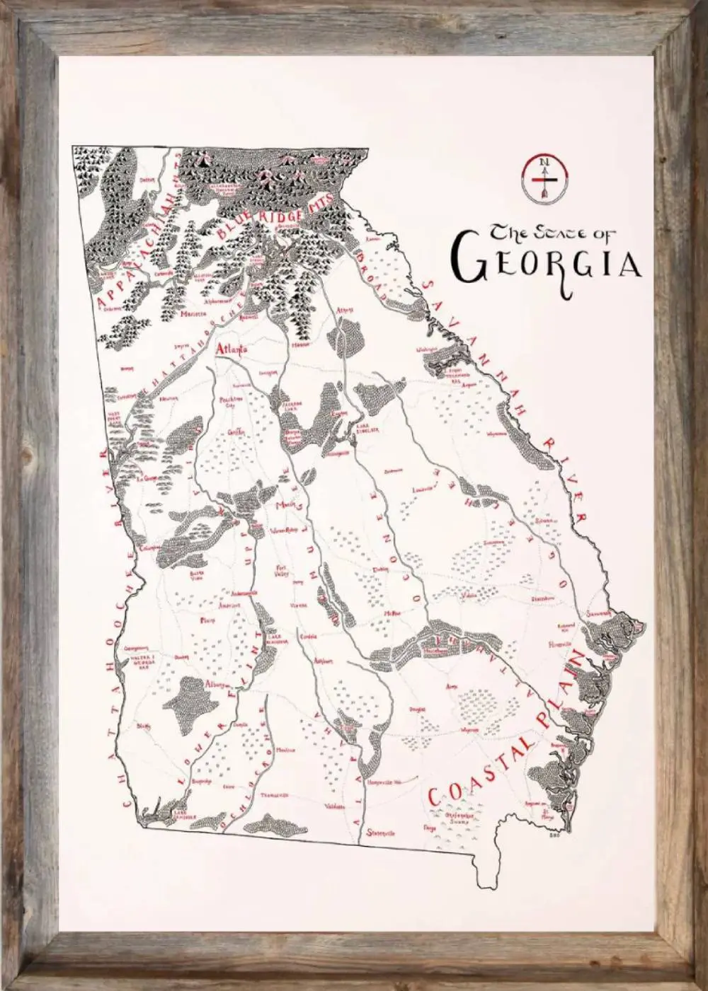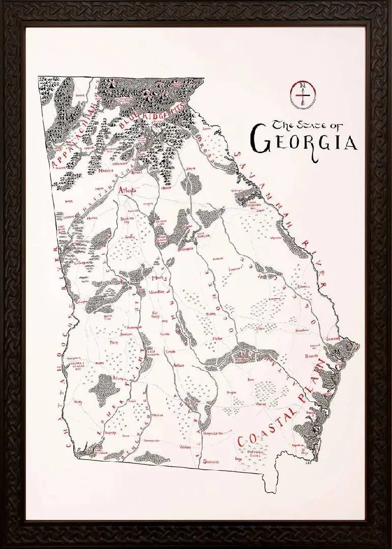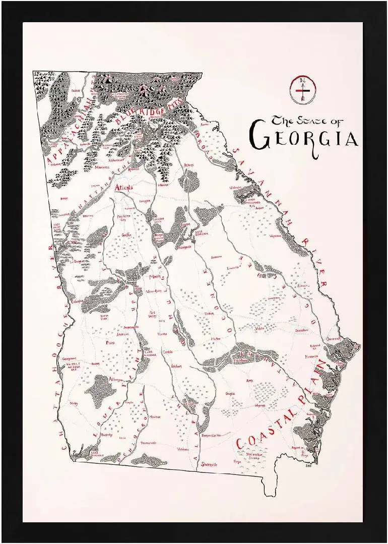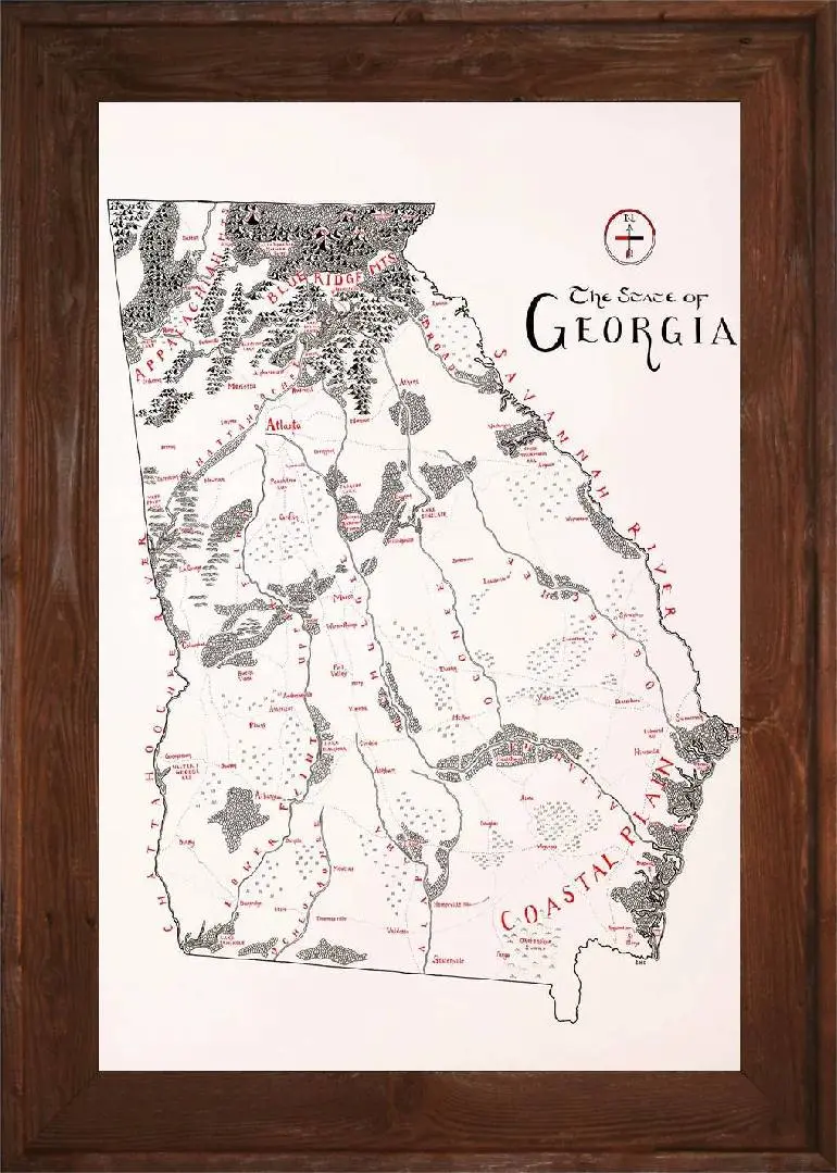 Beautiful Framed Georgia Map! This map is hand drawn in a lord of the rings style design and is printed on high quality paper. This map represents the great state of Georgia and can bring history to your home or office. The Georgia Map features all the incredible geographical locations of this amazing state.