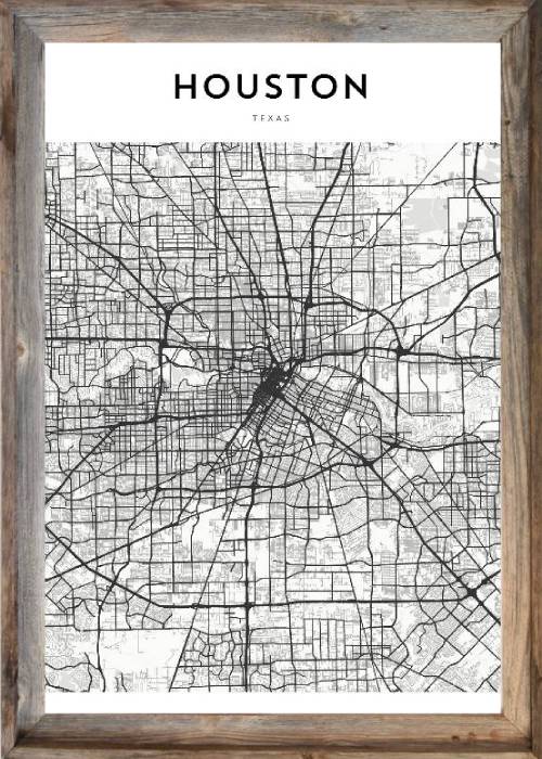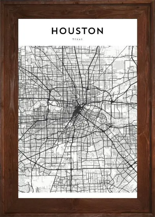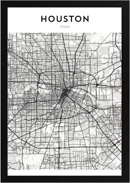 Amazing Framed Houston Map! This map is a black and white grid system style sketch of the city of Houston. Hang this stylish wall decoration in your home or office to show where you are from in a classy way.