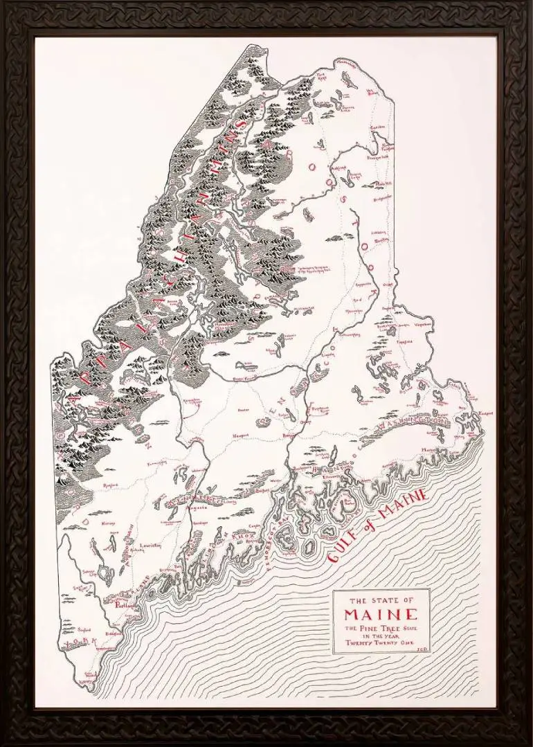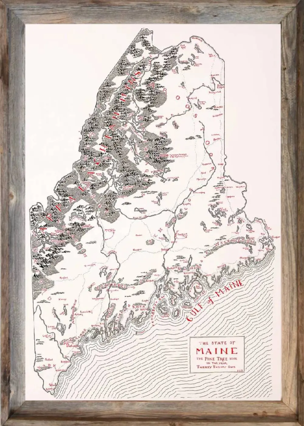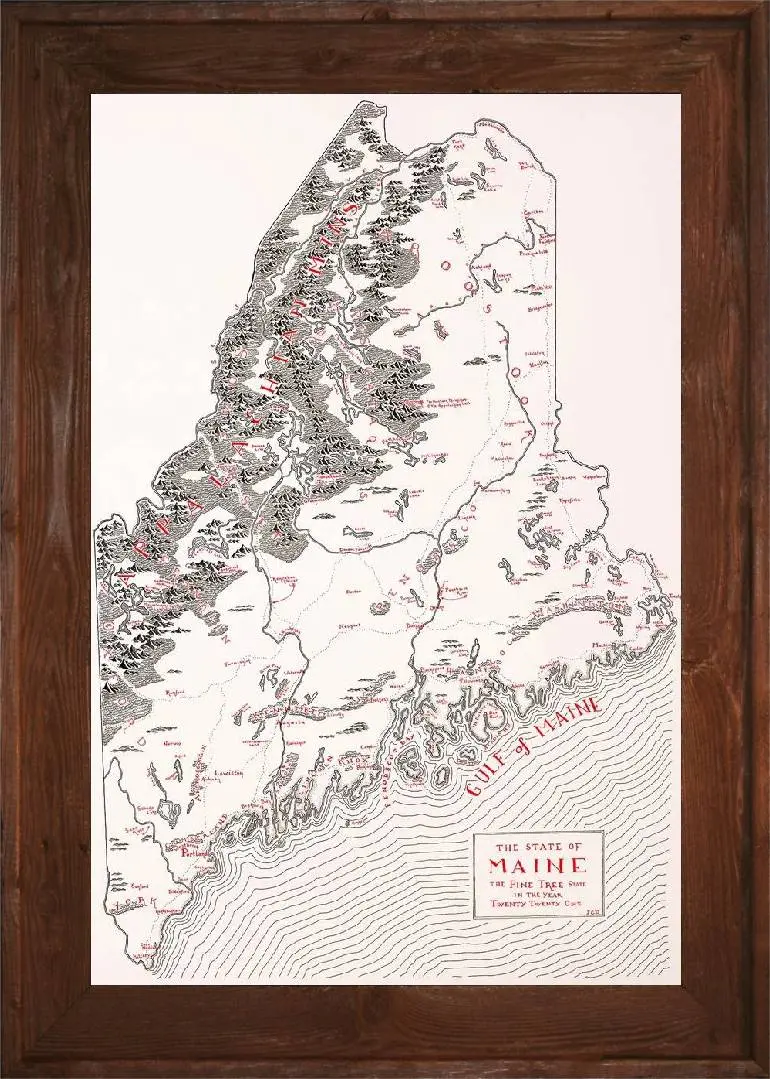 Beautiful Framed Maine Map! This map is hand drawn in a lord of the rings style design and is printed on high quality paper. This map represents the great state of Maine and can bring history to your home or office. The Maine Map features all the incredible geographical locations of this amazing state.