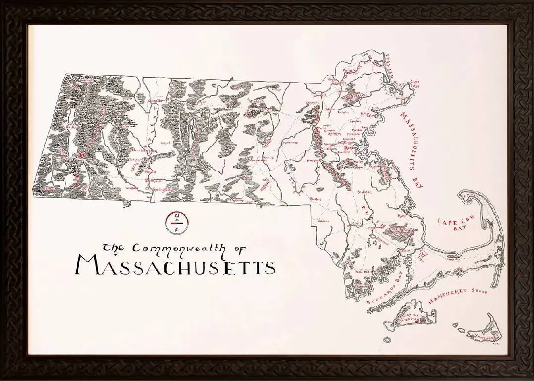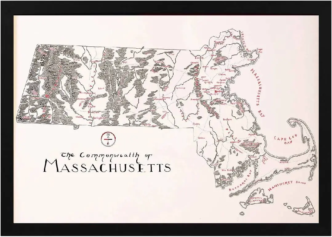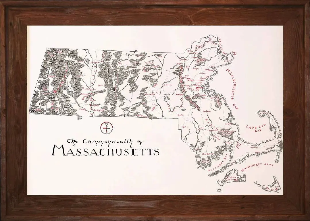 Beautiful Framed Massachusetts Map! This map is hand drawn in a lord of the rings style design and is printed on high quality paper. This map represents the great state of Massachusetts and can bring history to your home or office. The Massachusetts Map features all the incredible geographical locations of this amazing state.