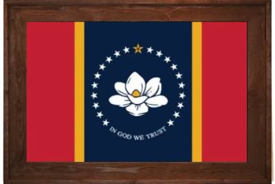 Very nice looking Framed Mississippi Flag! This flag represents the proud history of the state of Mississippi and can bring a bit of character to your home or office. Featuring red, white, and yellow vertical stripes with a white and gold magnolia, this framed decoration item is easily mountable and the perfect gift for any native of Mississippi.
