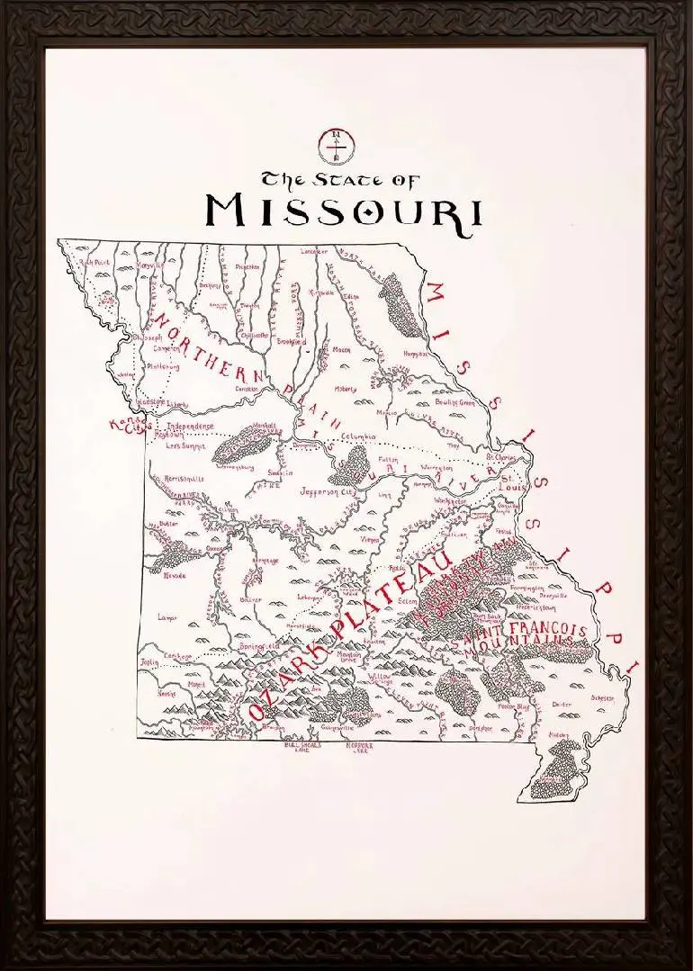 Beautiful Framed Missouri Map! This map is hand drawn in a lord of the rings style design and is printed on high quality paper. This map represents the great state of Missouri and can bring history to your home or office. The Missouri Map features all the incredible geographical locations of this amazing state.