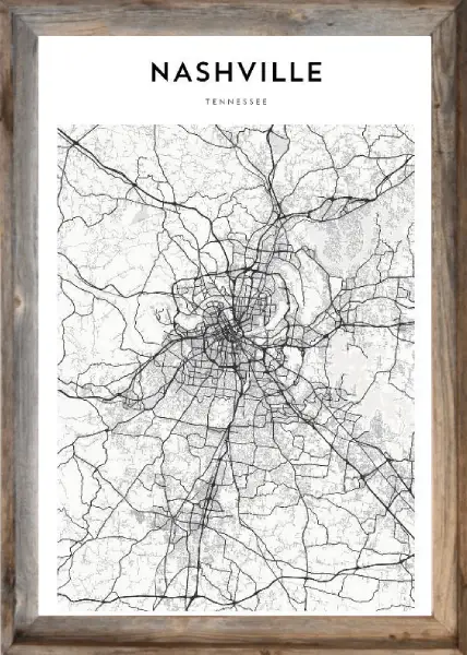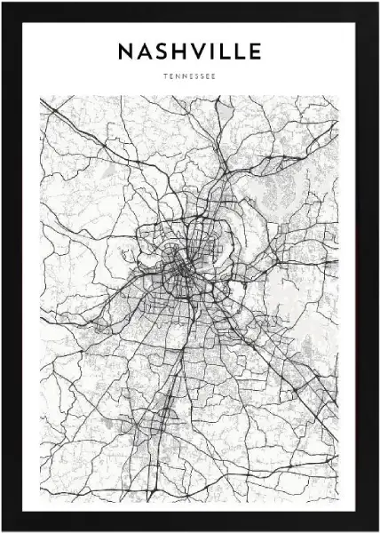 Incredible Framed Nashville Map! This map is a black and white grid system style sketch of the city of Nashville. Hang this stylish wall decoration in your home or office to show where you are from in a classy way.