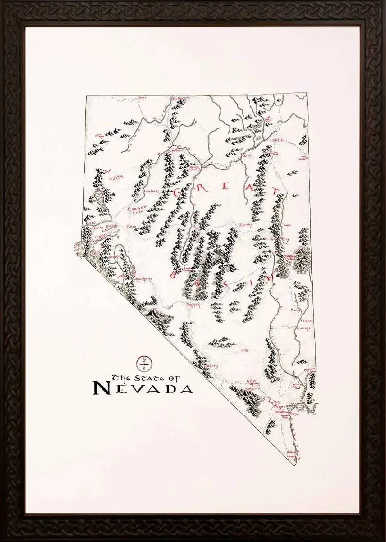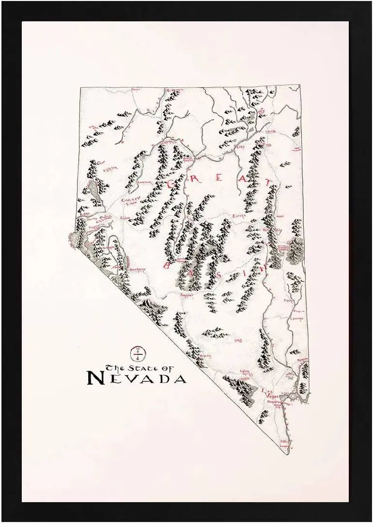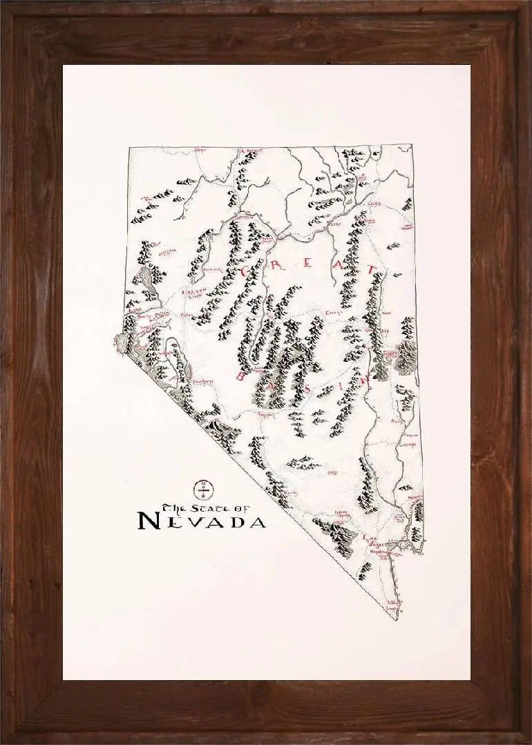 Beautiful Framed Nevada Map! This map is hand drawn in a lord of the rings style design and is printed on high quality paper. This map represents the great state of Nevada and can bring history to your home or office. The Nevada Map features all the incredible geographical locations of this amazing state.