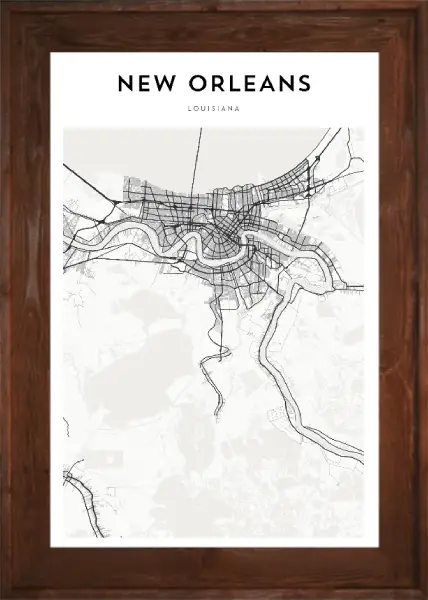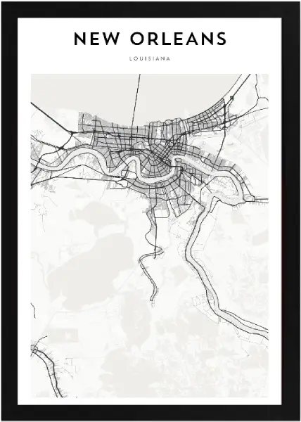 Incredible Framed New Orleans Map! This map is a black and white grid system style sketch of the city of New Orleans. Hang this stylish wall decoration in your home or office to show where you are from in a classy way.