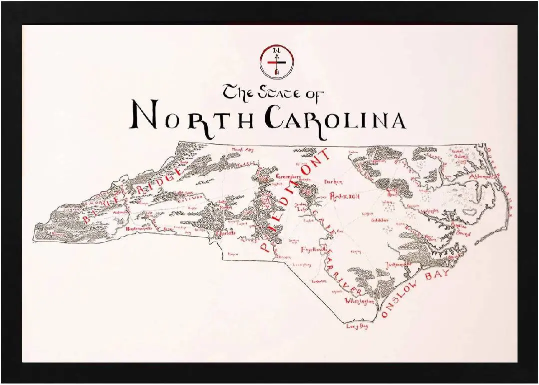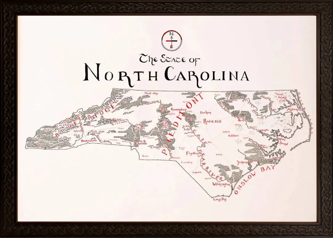 Beautiful Framed North Carolina Map! This map is hand drawn in a lord of the rings style design and is printed on high quality paper. This map represents the great state of North Carolina and can bring history to your home or office. The North Carolina Map features all the incredible geographical locations of this amazing state.