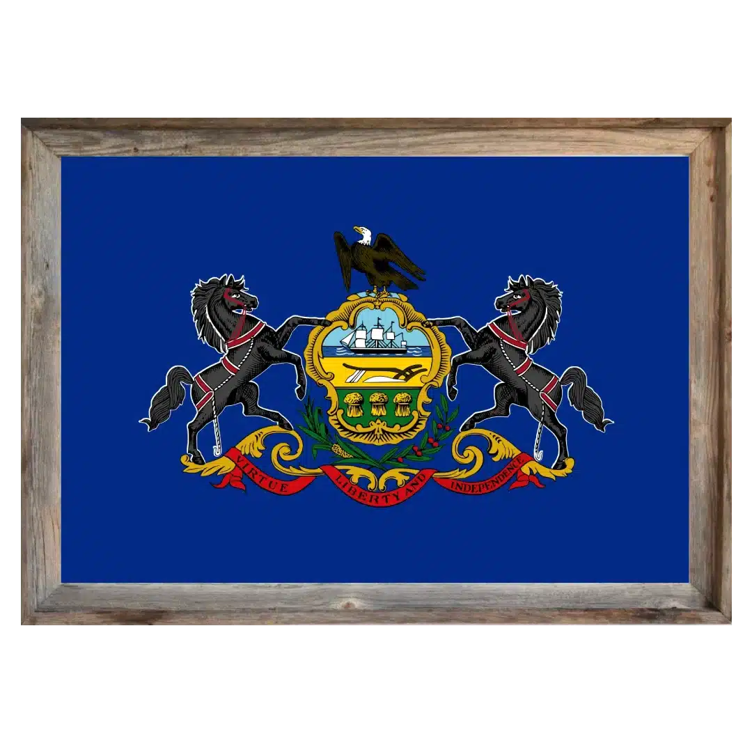 This nylon Pennsylvania Flag also comes in a 3 foot by 5 foot option that you can select at the top of the menu. This option takes a couple more weeks to ship than the 2×3 foot flag. All flags come in either a rustic light barnwood frame made in Texas, custom dark stained finish barnwood frame or our sleek black frame.