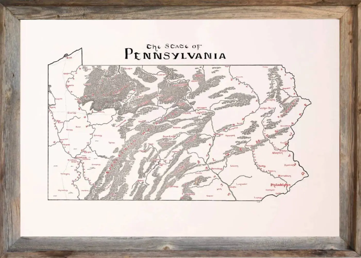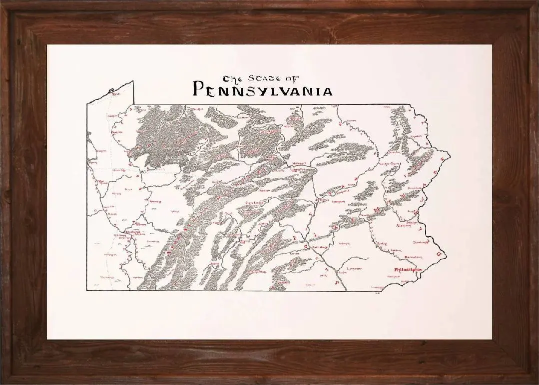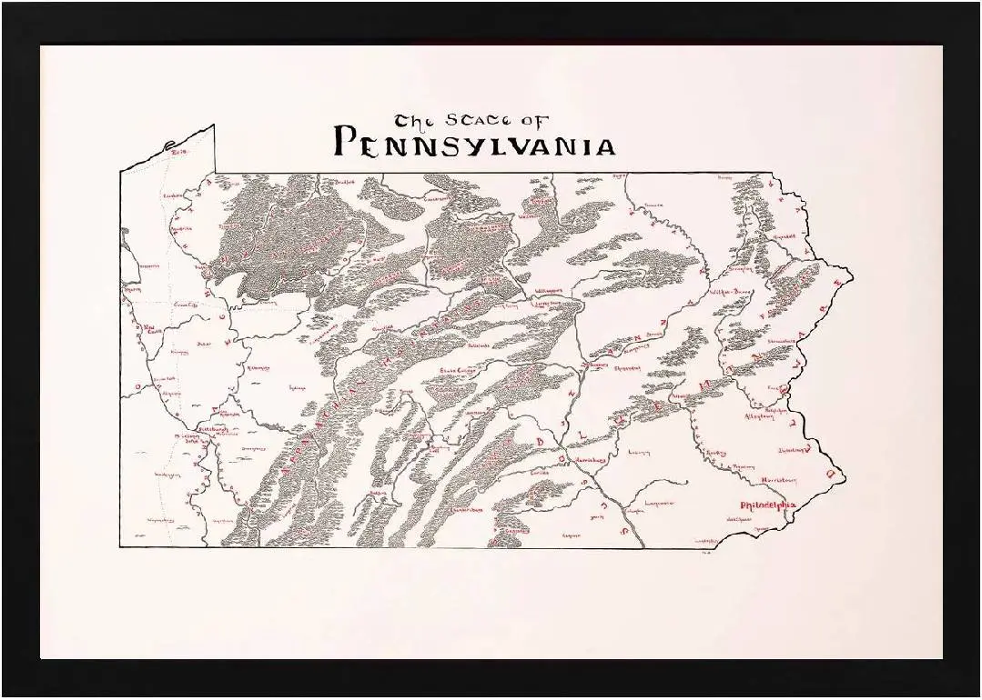 Beautiful Framed Pennsylvania Map! This map is hand drawn in a lord of the rings style design and is printed on high quality paper. This map represents the great state of Pennsylvania and can bring history to your home or office. The Minnesota Map features all the incredible geographical locations of this amazing state.