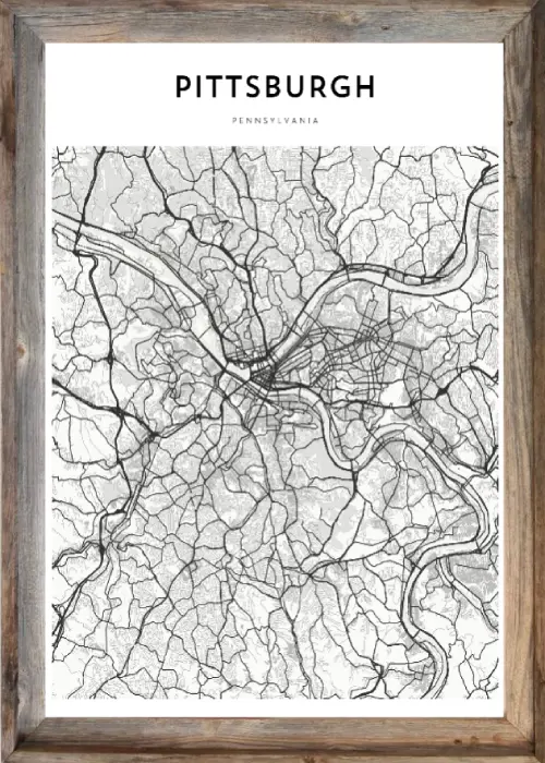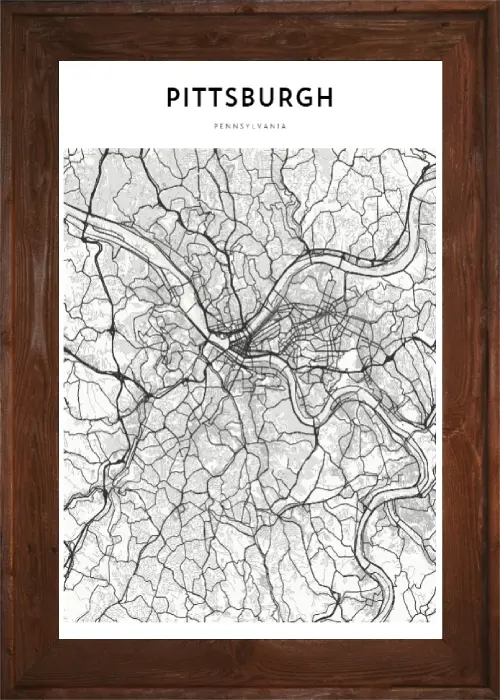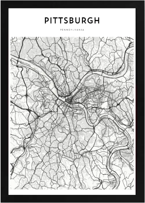 Amazing Framed Pittsburgh Map! This map is a black and white grid system style sketch of the city of Pittsburgh. Hang this stylish wall decoration in your home or office to show where you are from in a classy way.