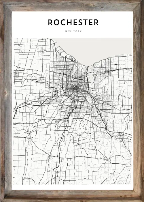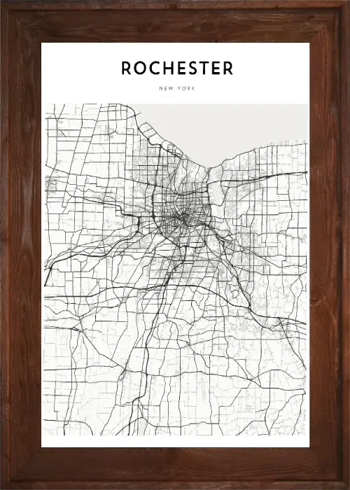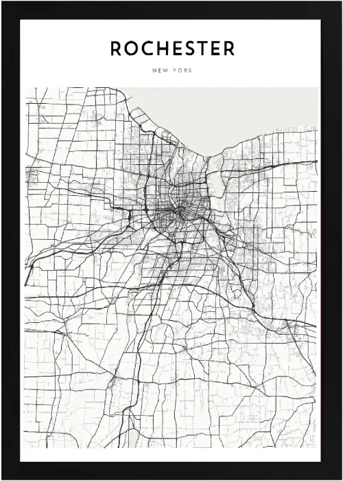 Awesome Framed Rochester Map! This map is a black and white grid system style sketch of the city of Rochester. Hang this stylish wall decoration in your home or office to show where you are from in a classy way.