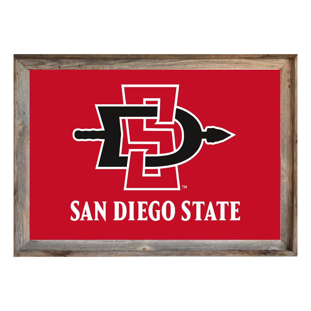 Show your support for the University of San Diego State with this SDSU Flag. The perfect decoration for your home, office, or any available wall space. Showcase your Alma mater or favorite college team! Featuring the San Diego State University logo on a red background. This framed decoration item is easily mountable and the perfect gift for any San Diego State alumni you may know.