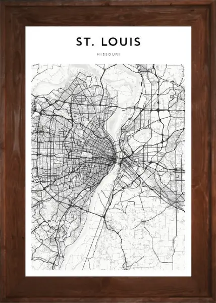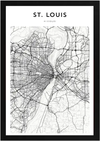 Lovely Framed St. Louis Map! This map is a black and white grid system style sketch of the city of St. Louis. Hang this stylish wall decoration in your home or office to show where you are from in a classy way.