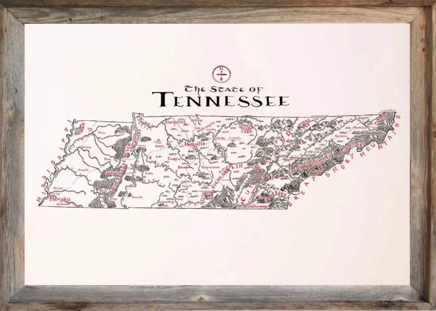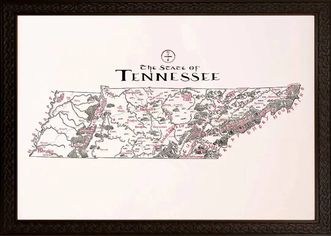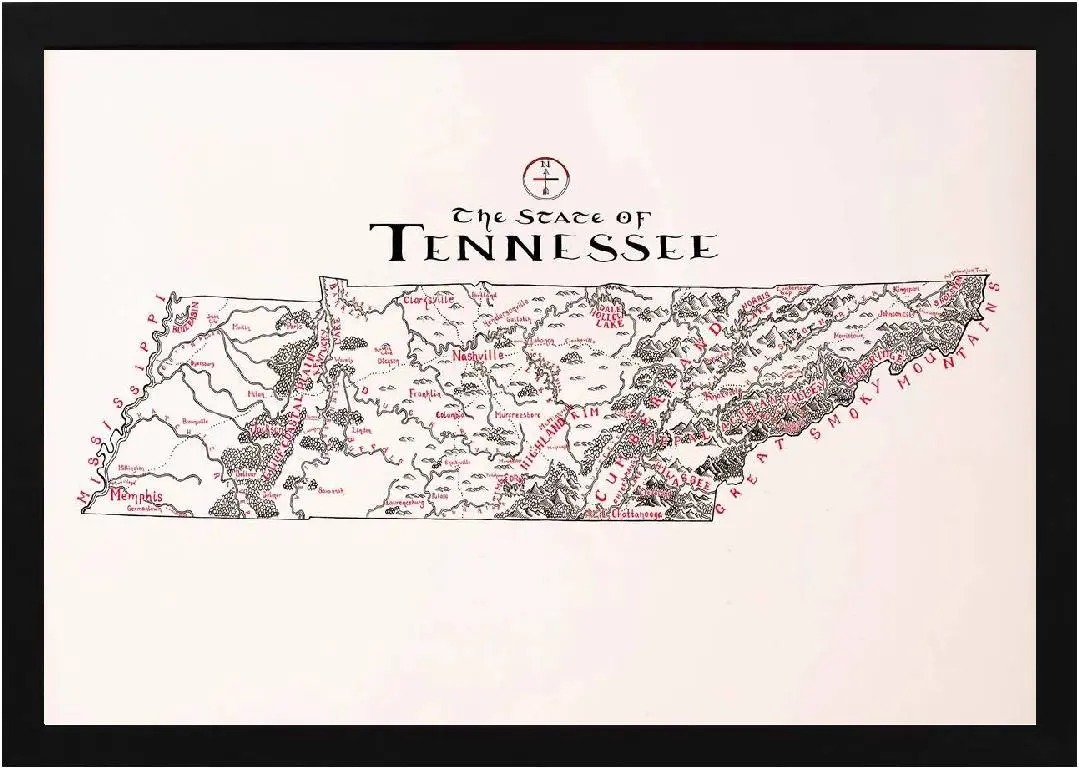 Beautiful Framed Tennessee Map! This map is hand drawn in a lord of the rings style design and is printed on high quality paper. This map represents the great state of Tennessee and can bring history to your home or office. The Tennessee Map features all the incredible geographical locations of this amazing state.