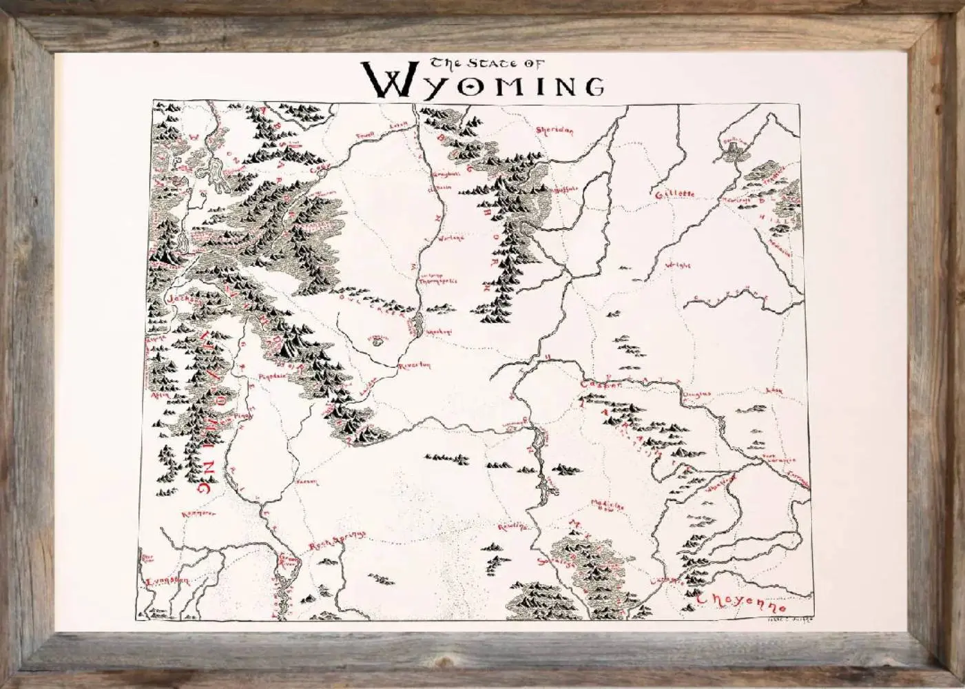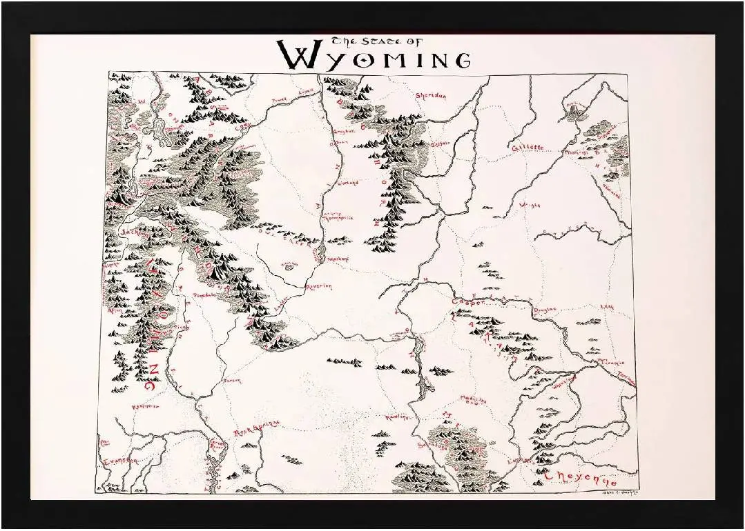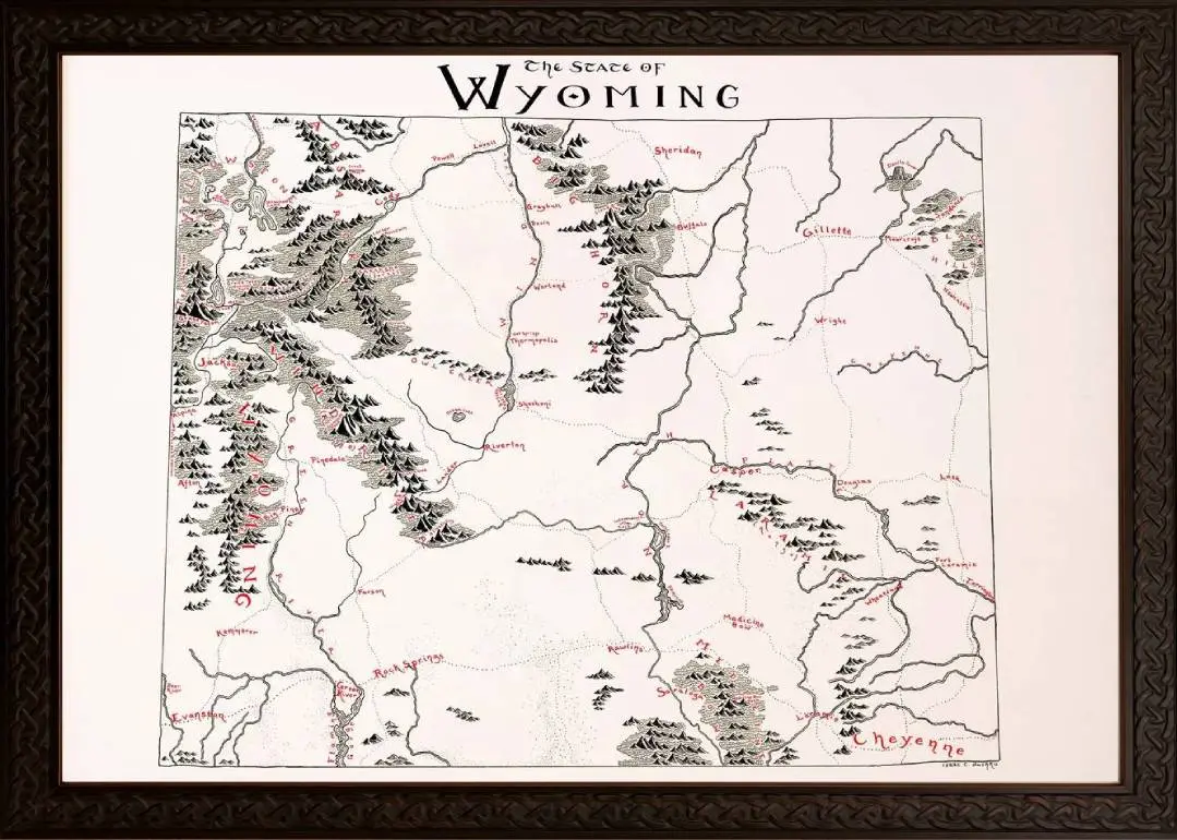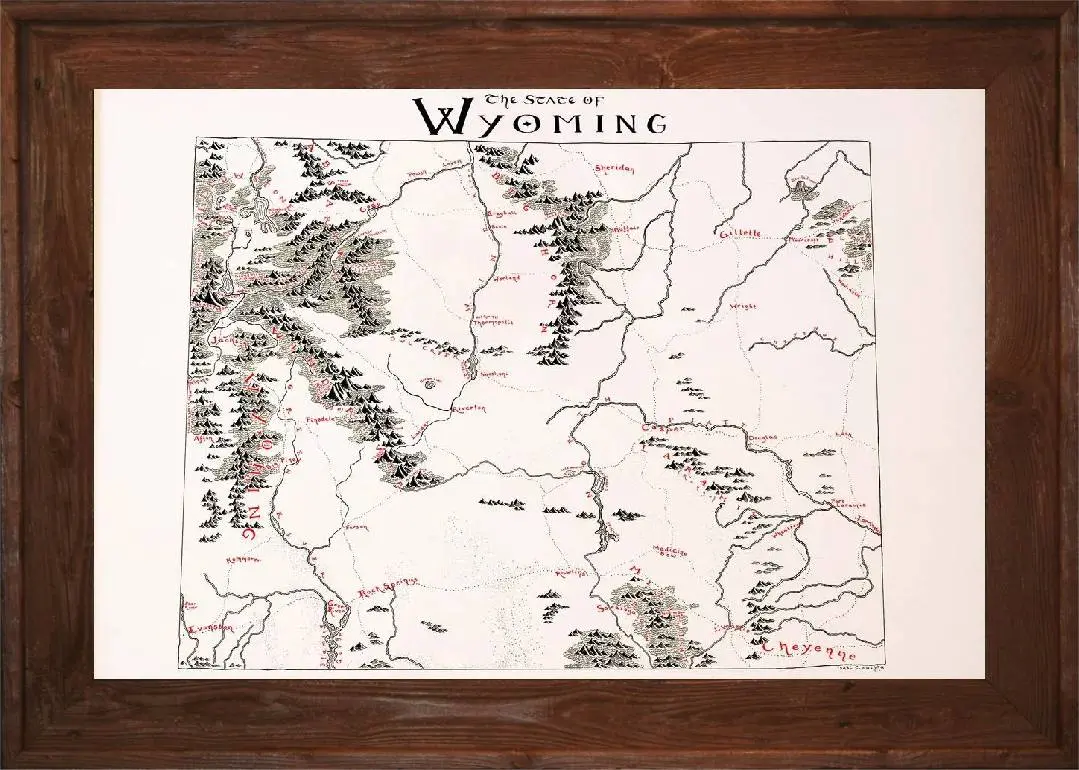 Beautiful Framed Wyoming Map! This map is hand drawn in a lord of the rings style design and is printed on high quality paper. This map represents the great state of Wyoming and can bring history to your home or office. The Wyoming Map features all the incredible geographical locations of this amazing state.